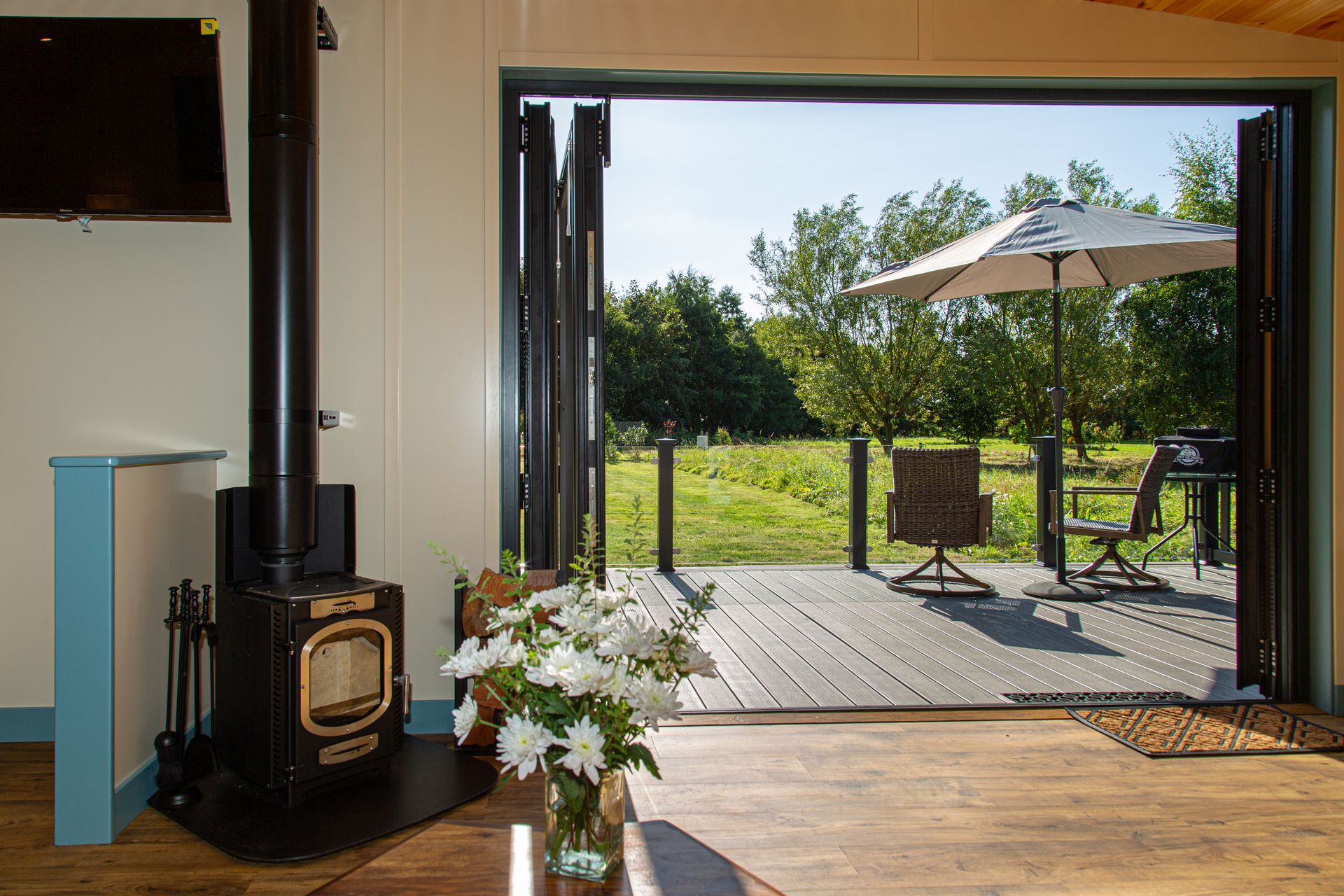 Suitable for all seasons with log burner and bifold doors to bring the outside in. We have created a large glass-fronted decking area with sunken hot tub for two and BBQ for you to relax and enjoy the privacy and tranquillity of our rural site.